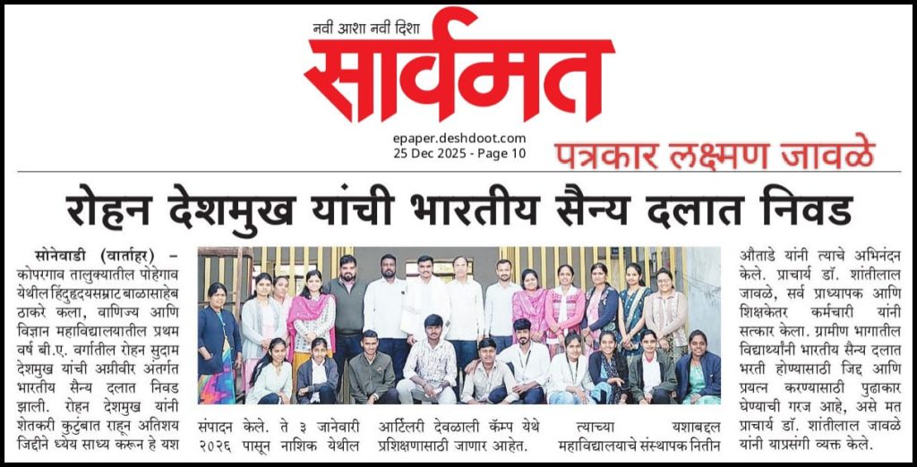 हिंदुहृदयसम्राट माननीय बाळासाहेब ठाकरे कला, वाणिज्य व विज्ञान महाविद्यालय, पोहेगाव व राष्ट्रीय सेवा योजना यांच्या संयुक्त विद्यमाने आयोजित विशेष श्रम संस्कार शिबिर समारोप समारंभा प्रसंगी बोलताना मा. श्री. बाळासाहेब कोळेकर साहेब (अप्पर जिल्हाधिकारी , शिर्डी, अहमदनगर उत्तर), समावेत मा.श्री.कैलासबापु कोते(प्रथम लोकनियुक्त नगराध्यक्ष, नगरपरिषद शिर्डी), महविद्यालयाचे संस्थापक मा.श्री.नितीनजी औताडे, मा.श्री.शिवाजीराव खामकर(मा. बार . असोसिएशन कोपरगाव ),प्राचार्य डॉ. मा.श्री.शांतीलाल जावळे , ग्रामस्थ, विद्यार्थी, शिक्षक व शिक्षकेतर सेवक उपस्थित होते.